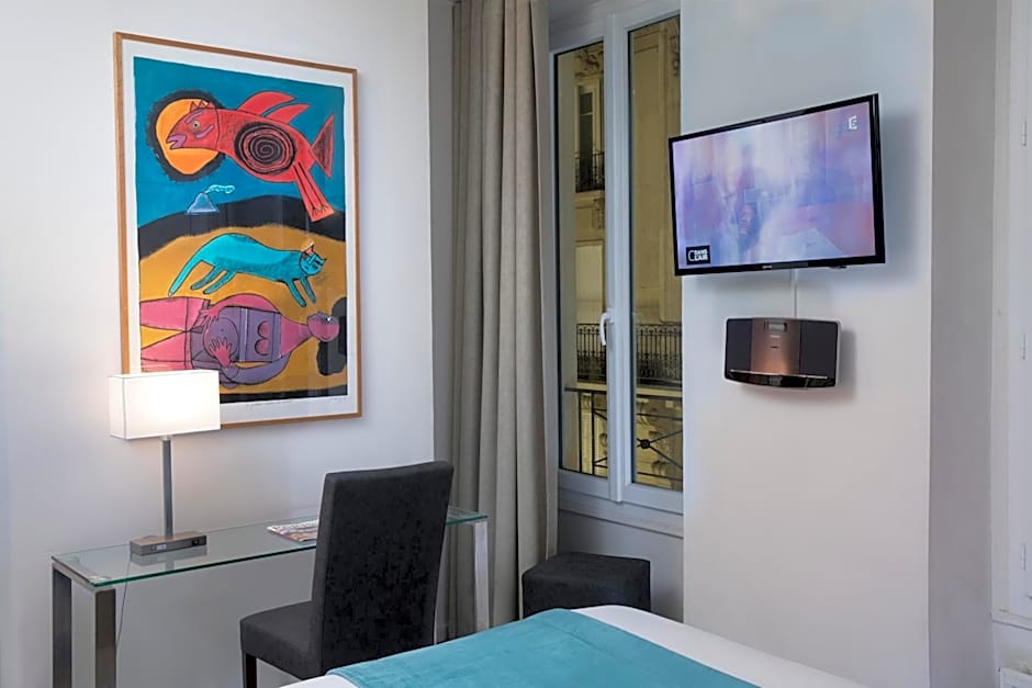 Ideal single room, bed 120 to 140 x 200, design and contemporary style, large flat TV screen. Room has view on courtyard and garden (quiet). Bathroom includes glass basin, halogen lighting, with swiss made hair dryer and international razor outlet
