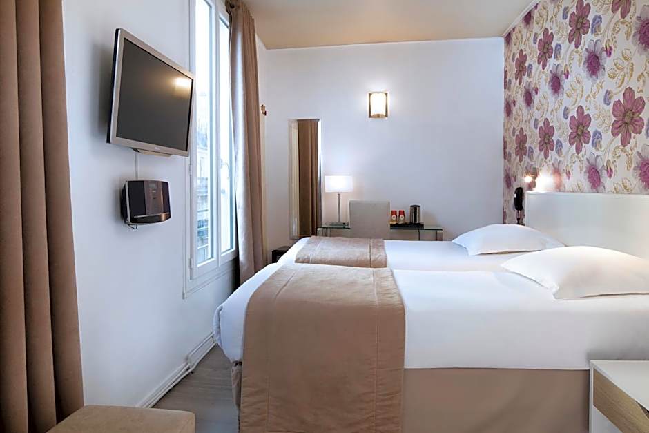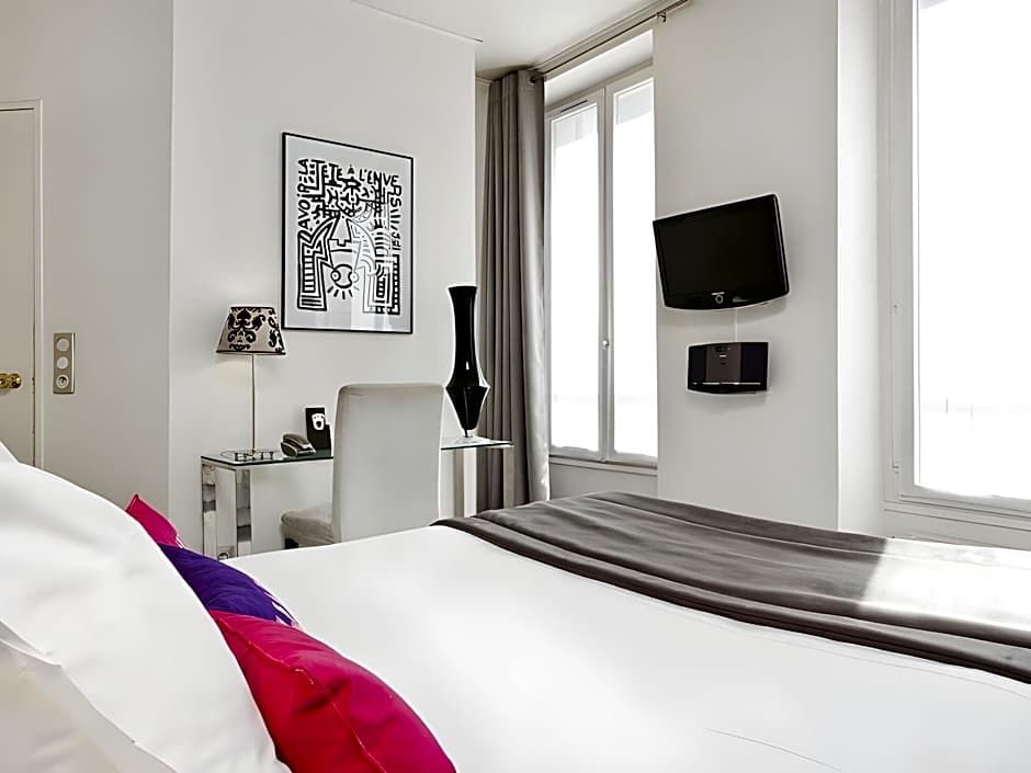 Room « SPACIOUS » with large double room , bed 160 to 180 x 79 in (queen or king size bed, available with twin beds also) ; design and contemporary, large flat TV screen. Room has a south sunny exposure on a quiet street. Bathroom includes glass basin, halogen lighting, with swiss made hair dryer and international razor outlet.